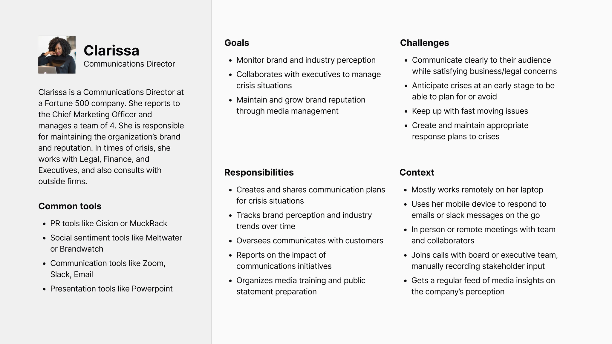 The ideal customers we would target with this product are people with leadership positions in Fortune 500 Communications verticals. We researched their tooling, behaviors, ambitions, and pain points to help inform what a valuable tool would look like for them.
