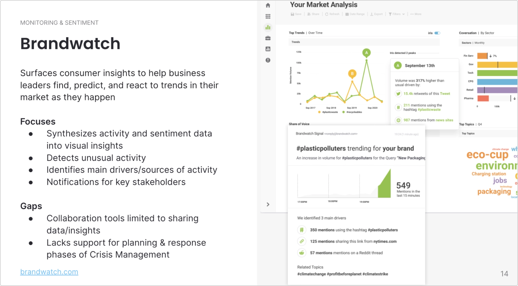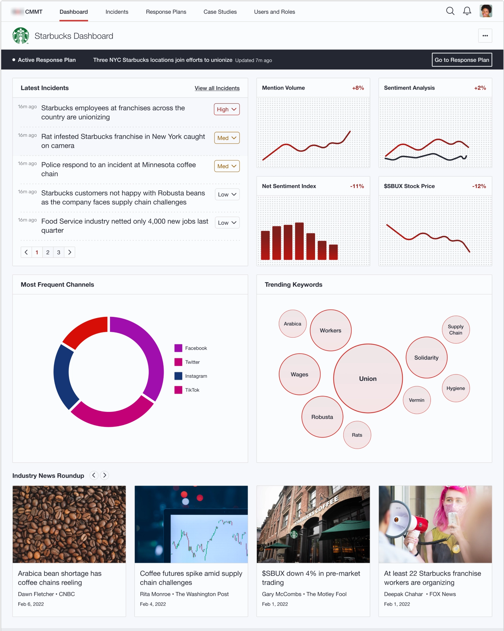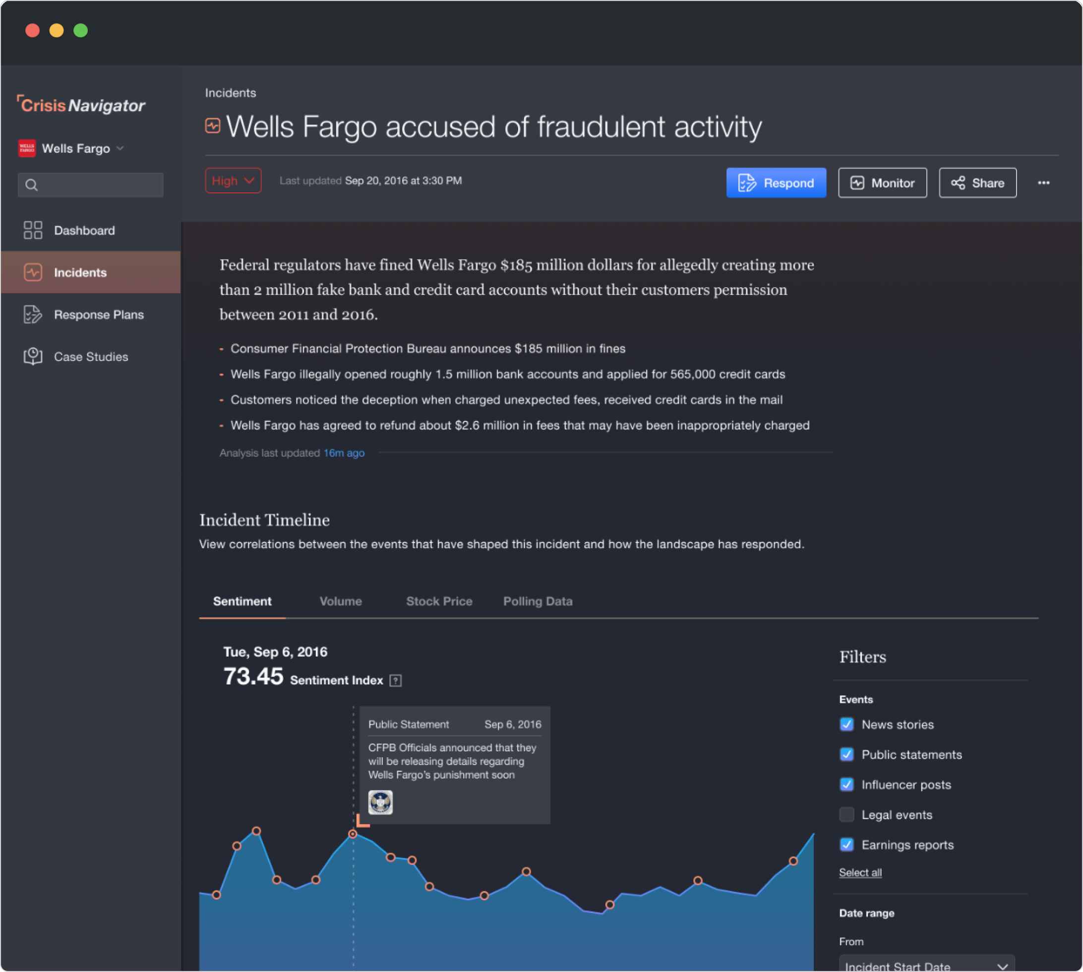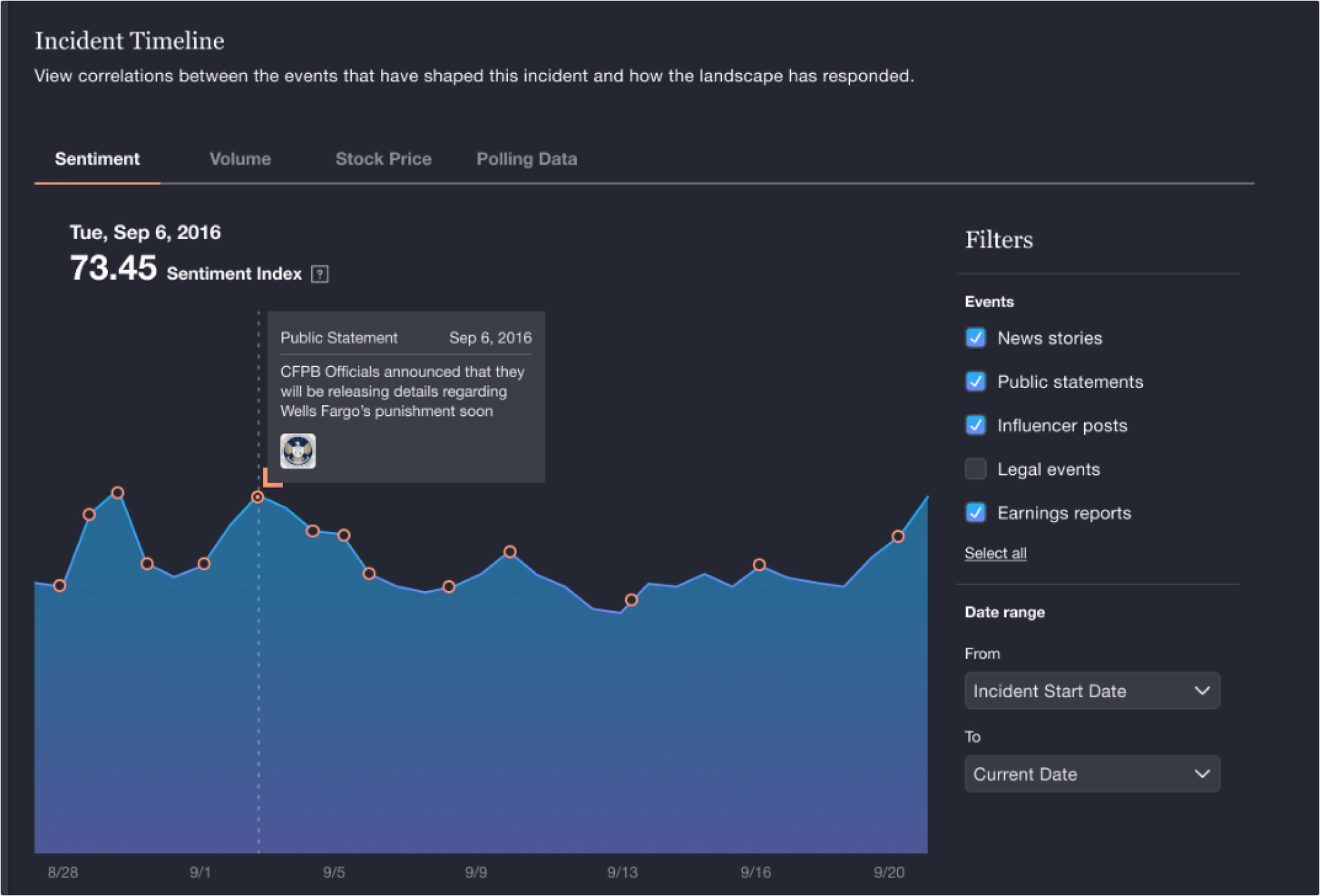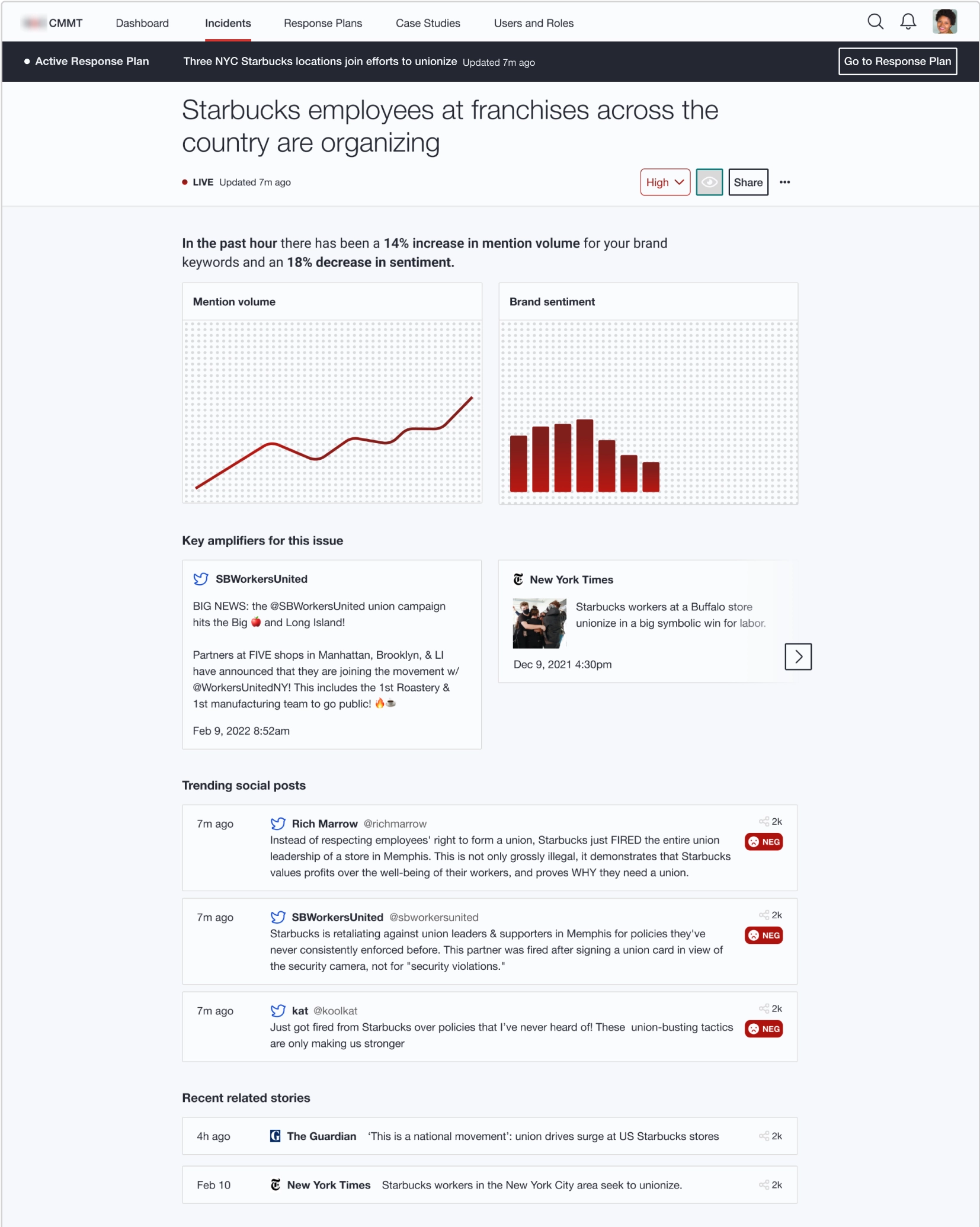 One job of the incident page is to help users understand how audiences are reacting, or being impacted, by a given incident. I designed a timeline view as a way to chart the events that make up an incident against important metrics like stock price, audience sentiment, or mention volume.
