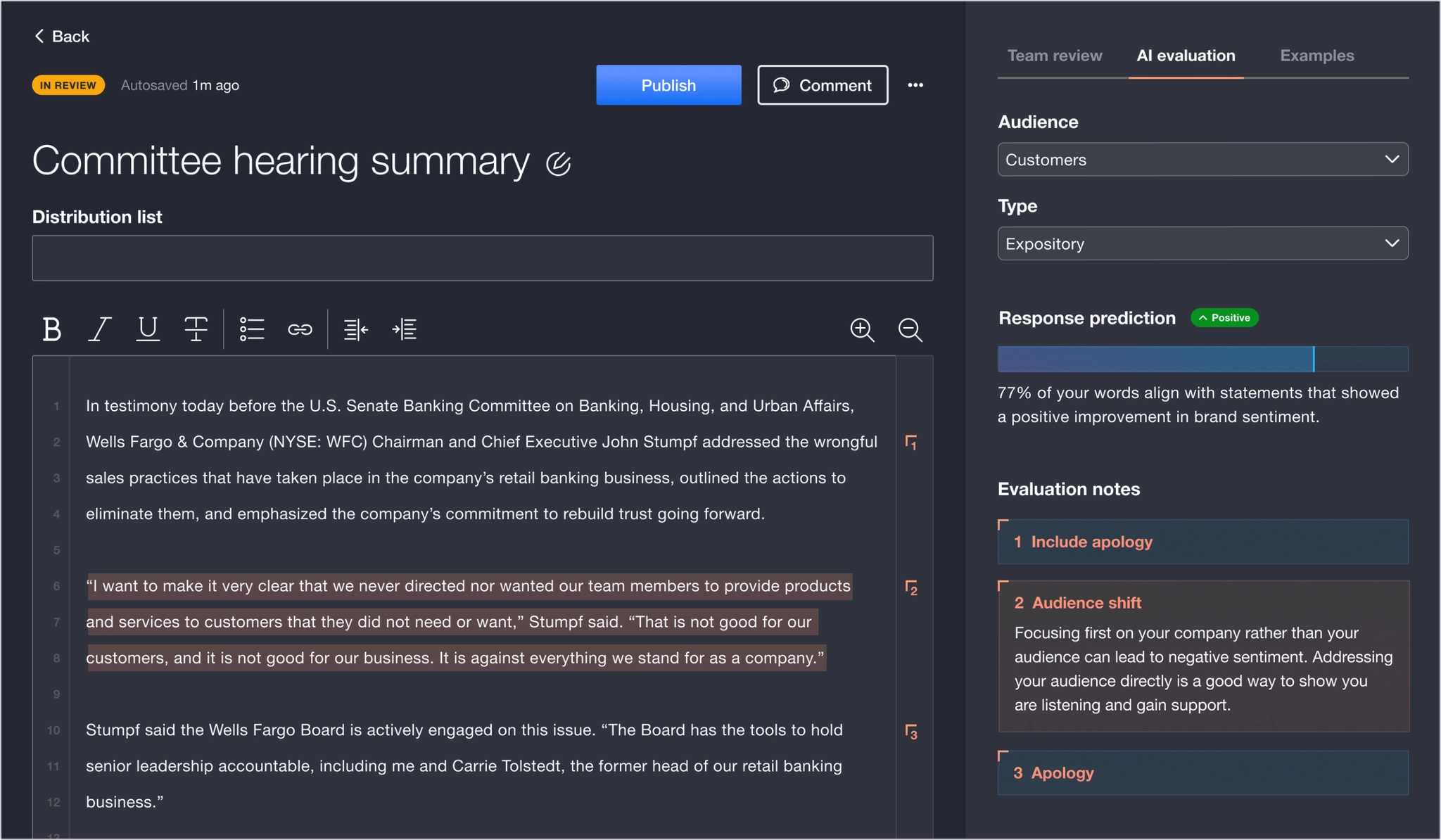We were also inspired by tools like Grammarly that use AI to support better written work. We designed a collaborative drafting tool that could also provide recommendations for a more effective statement.